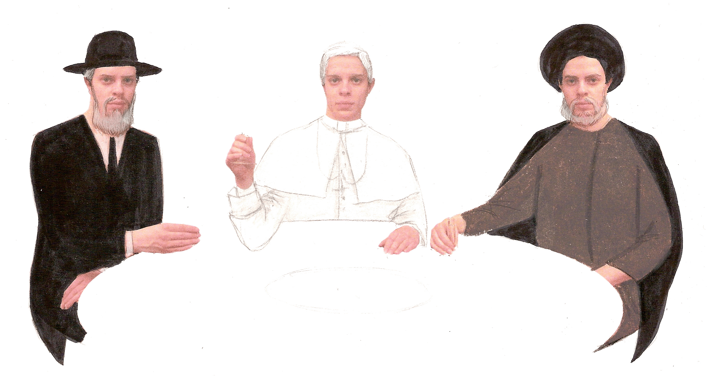 “Because of their physical likeness, the Casilio sisters have the uncanny ability to portray “everyman.” With a single image, if not a look, they can convey the deep and profound sense of humanity we all share regardless of gender, race, culture, or religion. TRIIIBE illuminates that equity in Table for Three, an image that unites a Jewish Rabbi, a Catholic Priest, and a Muslim Imam. These are aging men who represent religions with core principles of goodness, compassion, and peace. Such commonalities are vital to bear in mind, especially with dangerous fearmongering and isolated, extremist actions of hate taking place the world over. In titling and staging the image in this way, TRIIIBE also underscores the fact that there are no seats for women at this table. This absence of the “everywoman” similarly allows Table for Three to prompt questions about gender bias and the roles of religious women across belief systems, too.”